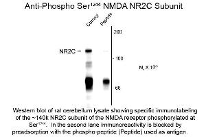 Background: NMDA R2C pS1244 Antibody detects phophorylated NMDA R2C protein. The ion channels activated by glutamate that are sensitive to N-methyl-D-aspartate (NMDA) are designated NMDA receptors (NMDAR). The NMDAR plays an essential role in memory, neuronal development and it has also been implicated in several disorders of the central nervous system including Alzheimer's, epilepsy and ischemic neuronal cell death. The NMDA receptor is also one of the principal molecular targets for alcohol in the CNS. The NMDAR is also potentiated by protein phosphorylation. The NR2C subunit of the receptor is thought to influence the NMDAR conductance level. Phosphorylation of Ser1244 has been shown to regulate NMDA receptor channel function. Anti-NMDA R2C pS1244 Antibody is ideal for investigators involved in Neuroscience, Signal Transduction, and Cell Signaling Research.