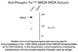 Anti-NMDA R2A pY1325 Antibody is tested for use in Western Blotting. Specific conditions for reactivity should be optimized by the end user. Expect a band of approximately 180 kDa in size corresponding to NMDAR NR2A subunit protein phosphorylated at Tyr 1325 in the appropriate cell lysate or extract.