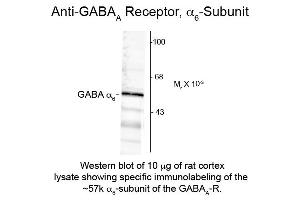 Anti-GABA(A) Receptor alpha 6 (Rabbit) antibody has been tested in Western Blotting. Specific conditions for reactivity should be optimized by the end user. Expect a band of approximately 57 kDa in size corresponding to the alpha 6 subunit of the GABA(A) receptor in the appropriate cell lysate or extract.