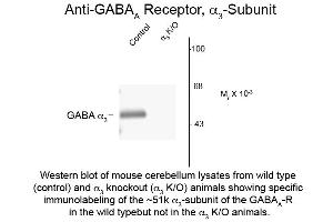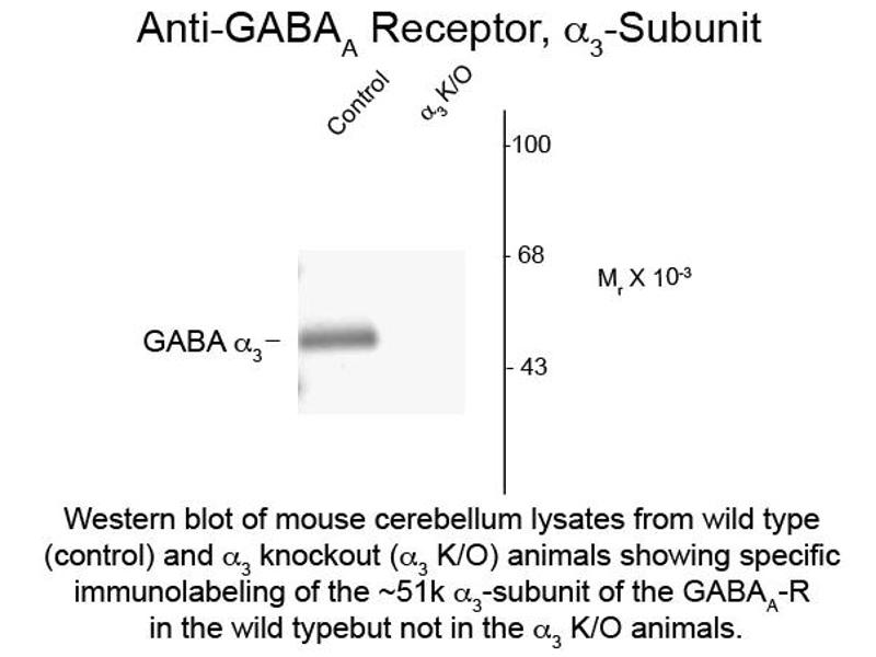 Anti-GABA(A) Receptor alpha 3 (Rabbit) antibody is tested for use in Western Blotting and IHC. Specific conditions for reactivity should be optimized by the end user. Expect a band of approximately 51 kDa in size corresponding to the alpha 3 subunit of the GABA(A) receptor in the appropriate cell lysate or extract.