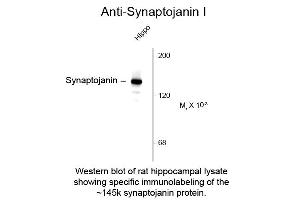 Anti-Synaptojanin 1 antibody is tested for use in Western Blotting and IHC. Expect a band of approximately 145 kDa in size corresponding to synaptojanin I proteins of rat brain extracts. Researchers should determine optimal titers for applications that are not stated below.