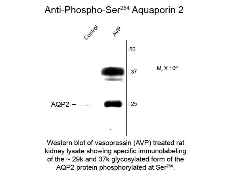 Anti-Aquaporin 2 pS264 antibody is tested for use in ELISA, Western Blotting. Specific conditions for reactivity should be optimized by the end user. Expect a band of approximately 29 kDa in size corresponding to AQP2 protein phosphorylated at Ser264 in the appropriate cell lysate or extract. This antibody also recognizes the glycosylated form of aquaporin 2 protein at approximately 37 kDa in size.