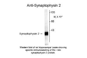 Anti-Synaptophysin 2 (Rabbit) antibody is tested for use in Western Blotting and ICC. Specific conditions for reactivity should be optimized by the end user. Expect a band of approximately 38 kDa in size corresponding to the synaptoporin protein in the appropriate cell lysate or extract. Researchers should determine optimal titers for applications that are not stated below.