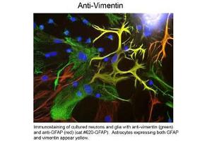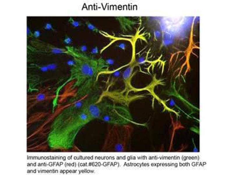 Background: Vimentin antibody recognizes Vimentin which is the major protein subunit of the 10nm or intermediate filaments (IFs) found in many kinds of mesenchymal and epithelial cells as well as developing neuronal and astrocytic precursor cells in the CNS. Vimentin is thought to be critically involved in lymphocyte adhesion and transmigration. Copolymers are frequently formed between vimentin and other IFs, such as GFAP (in many kinds of astrocytes), desmin (in muscle cells) and neurofilament proteins (in developing neurons). Antibodies to vimentin are useful in studies of stem cells and generally to reveal the filamentous cytoskeleton. Recent studies suggest that vimentin affects prostate cancer cells motility and invasiveness. Vimentin antibody is ideal for investigators involved in Neuroscience, Cell Migration and Cancer Research.