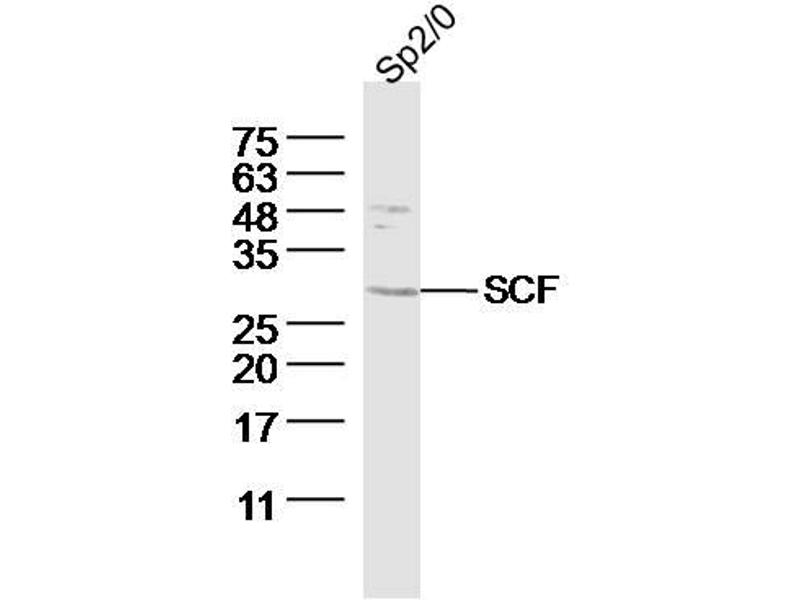 Background: Ligand for the receptor-type protein-tyrosine kinase KIT. Plays an essential role in the regulation of cell survival and proliferation, hematopoiesis, stem cell maintenance, gametogenesis, mast cell development, migration and function, and in melanogenesis. KITLG/SCF binding can activate several signaling pathways. Promotes phosphorylation of PIK3R1, the regulatory subunit of phosphatidylinositol 3-kinase, and subsequent activation of the kinase AKT1. KITLG/SCF and KIT also transmit signals via GRB2 and activation of RAS, RAF1 and the MAP kinases MAPK1/ERK2 and/or MAPK3/ERK1. KITLG/SCF and KIT promote activation of STAT family members STAT1, STAT3 and STAT5. KITLG/SCF and KIT promote activation of PLCG1, leading to the production of the cellular signaling molecules diacylglycerol and inositol 1,4,5-trisphosphate. KITLG/SCF acts synergistically with other cytokines, probably interleukins.