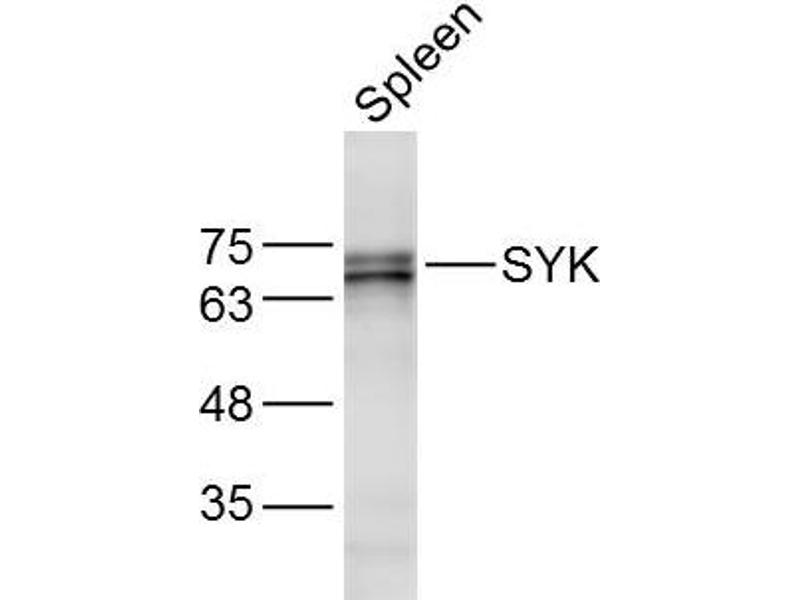 Background: Syk (72 kDa) is a non receptor protein tyrosine kinase that plays an important role in immune receptor signal transduction and is implicated in endothelial cell functions, including cell growth and migration. SYK is a positive effector of BCR stimulated responses. It couples the B cell antigen receptor (BCR) to the mobilization of calcium ions either through a phosphoinositide 3 kinase dependent pathway, when not phosphorylated on tyrosines of the linker region, or through a phospholipase C gamma dependent pathway, when phosphorylated on Tyr 342 and Tyr 346. Thus the differential phosphorylation of SYK can determine the pathway by which BCR is coupled to the regulation of intracellular calcium ions. Alternate Names: p72syk, Spleen tyrosine kinase, Tyrosine protein kinase SYK.