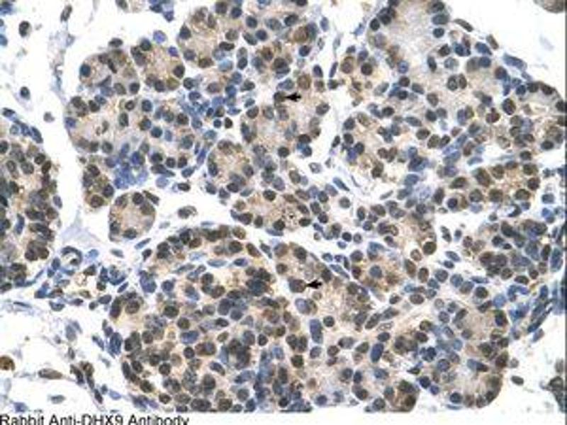 Synthetic peptide located between aa171-220 of human DHX9 (Q08211, NP_001348). Percent identity by BLAST analysis: Human, Chimpanzee, Gorilla, Orangutan, Gibbon, Monkey, Galago, Marmoset, Mouse, Rat, Elephant, Panda, Dog, Bovine, Bat, Rabbit, Horse (100%), Opossum, Platypus (92%), Xenopus (85%), Zebra finch (84%).