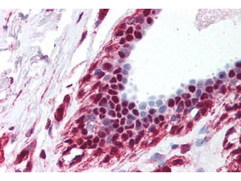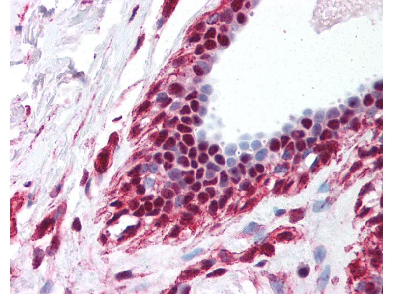 Usage: Immunohistochemistry: This antibody was validated for use in immunohistochemistry on a panel of 21 formalin-fixed, paraffin-embedded (FFPE) human tissues after heat induced antigen retrieval in pH 6.0 citrate buffer. After incubation with the primary antibody, slides were incubated with biotinylated secondary antibody, followed by alkaline phosphatase-streptavidin and chromogen. The stained slides were evaluated by a pathologist to confirm staining specificity. The optimal working concentration for this antibody was determined to be 5 μg/mL. -