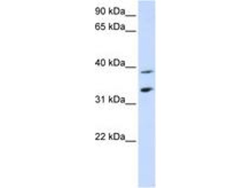 Synthetic peptide from C-Terminus of human SLC25A34 (Q6PIV7, NP_997231). Percent identity by BLAST analysis: Human, Chimpanzee, Gorilla, Gibbon, Galago, Marmoset, Mouse, Elephant, Panda, Dog, Bat, Rabbit, Horse, Pig, Platypus, Slime mold (100%), Monkey, Rat, Bovine, Opossum, Guinea pig (92%), Xenopus, Drosophila (90%).