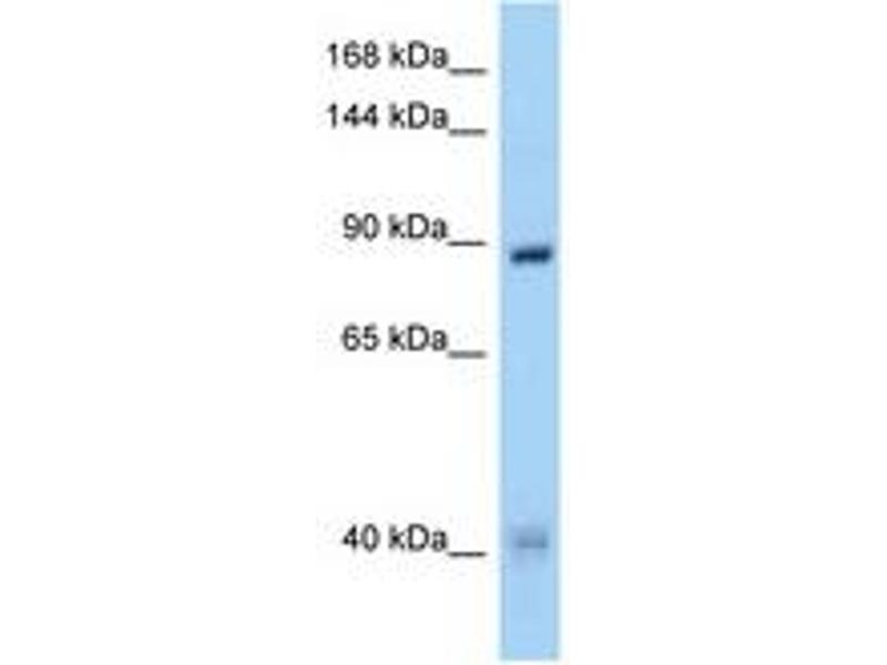 Synthetic peptide located between aa163-212 of human MUSK (O15146-3, NP_001159753). Percent identity by BLAST analysis: Human, Chimpanzee, Gorilla, Gibbon, Monkey, Marmoset, Mouse, Rat, Rabbit, Guinea pig (100%), Elephant, Panda, Dog, Bovine, Bat, Horse, Turkey, Zebra finch, Chicken (92%), Opossum, Platypus (85%), Stickleback (84%).