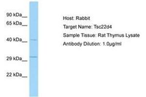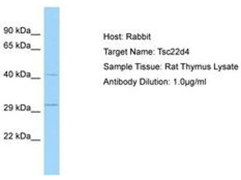 Synthetic peptide located between aa31-80 of rat Tsc22d4 (Q3B8N7, NP_001037749). Percent identity by BLAST analysis: Human, Chimpanzee, Gorilla, Orangutan, Rat (100%), Monkey, Galago, Marmoset, Dog, Rabbit (92%), Opossum (90%), Guinea pig (86%), Mouse, Bovine, Bat (85%), Panda (84%), Elephant (80%).