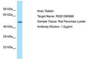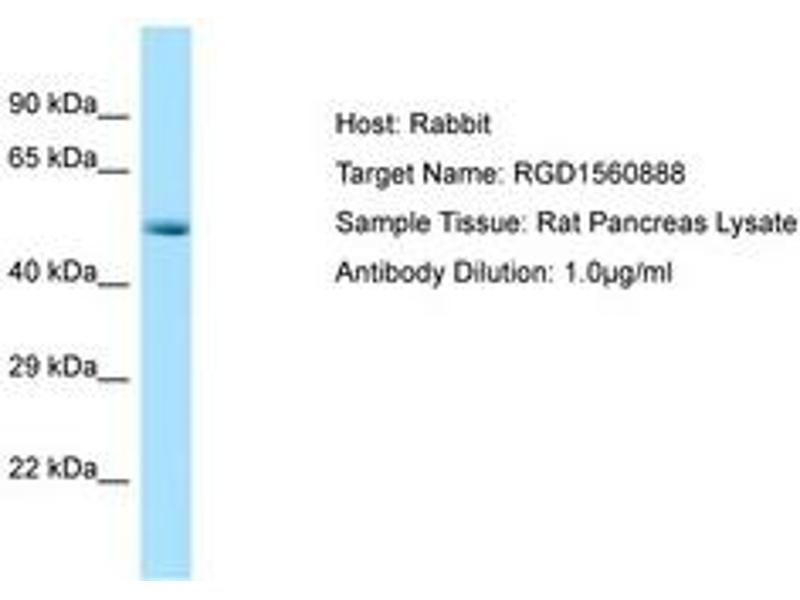 Synthetic peptide from N-Terminus of rat RGD1560888 (NP_001102531). Percent identity by BLAST analysis: Human, Chimpanzee, Gorilla, Orangutan, Gibbon, Monkey, Marmoset, Mouse, Rat, Dog, Elephant, Panda, Rabbit, Horse, Opossum, Zebra finch, Chicken, Platypus, Medaka, Salmon, Pufferfish, Zebrafish, Stickleback (100%), Xenopus (91%).