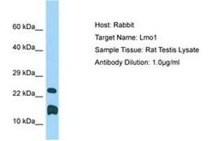 Synthetic peptide from C-Terminus of rat Lmo1 (D4A8W2, NP_620812). Percent identity by BLAST analysis: Human, Chimpanzee, Gorilla, Orangutan, Gibbon, Monkey, Galago, Marmoset, Rat, Elephant, Panda, Dog, Horse, Guinea pig (100%), Mouse, Bat, Opossum, Turkey, Zebra finch, Chicken (92%), Bovine, Rabbit, Lizard, Xenopus, Salmon, Stickleback, Medaka, Pufferfish, Zebrafish (85%).