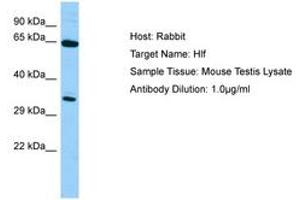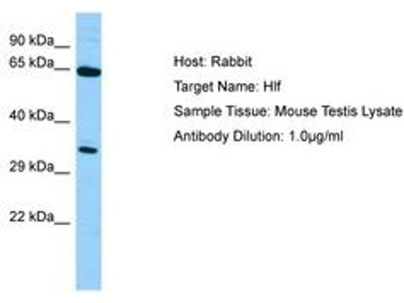Synthetic peptide from N-Terminus of mouse Hlf (Q8BW74, NP_766151). Percent identity by BLAST analysis: Human, Chimpanzee, Gorilla, Orangutan, Gibbon, Marmoset, Mouse, Rat, Elephant, Panda, Dog, Pig (100%), Guinea pig (92%), Horse (91%), Galago, Bat, Chicken, Lizard (85%), Rabbit, Zebra finch (83%).