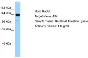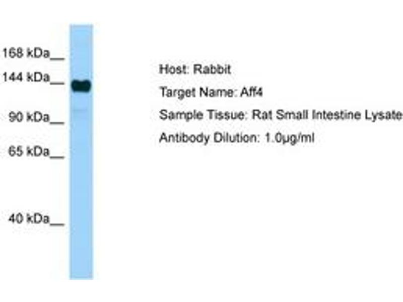 Synthetic peptide located between aa751-800 of rat Aff4 (NP_001100471). Percent identity by BLAST analysis: Human, Chimpanzee, Gorilla, Orangutan, Gibbon, Rat, Guinea pig (100%), Baboon, Monkey, Marmoset, Shrew, Bovine, Bat, Pig (92%), Turkey, Zebra finch, Chicken (86%), Mouse, Elephant, Dog, Rabbit, Horse, Opossum, Armadillo (85%).