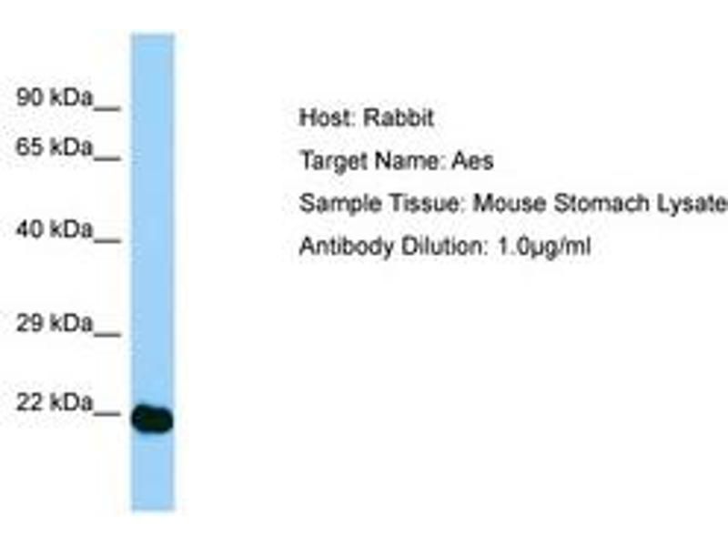Synthetic peptide from N-Terminus of mouse Aes (P63002, NP_034477). Percent identity by BLAST analysis: Human, Chimpanzee, Gorilla, Orangutan, Monkey, Galago, Marmoset, Mouse, Rat, Elephant, Dog, Bovine, Opossum, Guinea pig, Platypus, Xenopus, Frog (100%).