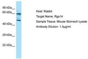 Synthetic peptide located between aa201-250 of mouse Rgs14 (P97492, NP_058038). Percent identity by BLAST analysis: Human, Chimpanzee, Gorilla, Orangutan, Gibbon, Monkey, Marmoset, Mouse, Elephant, Bat (100%), Galago, Panda, Dog, Bovine, Rabbit, Pig, Guinea pig (92%), Rat (85%).