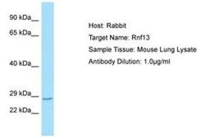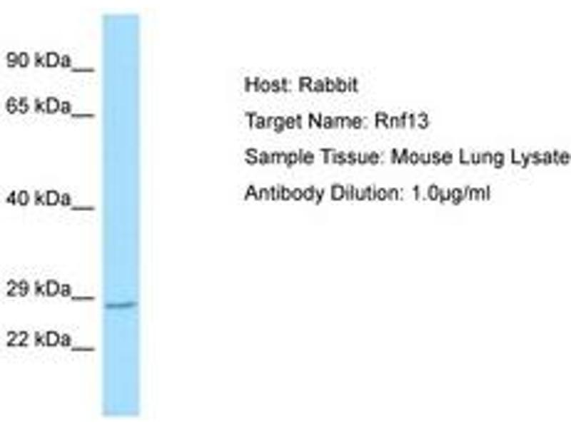 Synthetic peptide located between aa150-199 of mouse Rnf13 (Q3UTG4, NP_036013). Percent identity by BLAST analysis: Human, Chimpanzee, Gorilla, Orangutan, Gibbon, Monkey, Galago, Mouse, Rat, Elephant, Panda, Dog, Bovine, Bat, Rabbit, Horse, Pig, Opossum, Guinea pig, Platypus (100%), Marmoset, Turkey, Zebra finch, Chicken (92%).