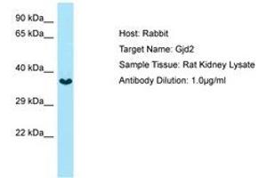 Synthetic peptide located between aa131-180 of rat Gjd2 (O70610, NP_062154). Percent identity by BLAST analysis: Human, Chimpanzee, Gorilla, Orangutan, Gibbon, Monkey, Galago, Marmoset, Mouse, Rat, Elephant, Panda, Dog, Bovine, Rabbit, Horse, Pig, Guinea pig (100%), Bat (92%), Opossum (85%).