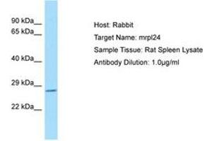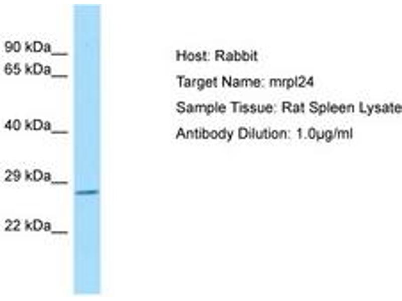 Synthetic peptide from C-Terminus of rat mrpl24 (Q66H47, NP_001007638). Percent identity by BLAST analysis: Human, Chimpanzee, Gorilla, Orangutan, Monkey, Galago, Marmoset, Mouse, Rat, Elephant, Panda, Dog, Bovine, Bat, Rabbit, Horse, Pig, Opossum, Guinea pig, Lizard, Xenopus (100%), Platypus, Catfish, Medaka, Pufferfish (92%), Turkey, Chicken, Salmon, Sablefish (84%).
