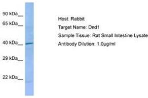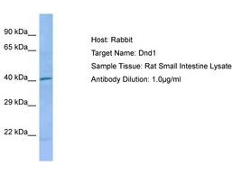 Synthetic peptide located between aa41-90 of rat Dnd1 (D3ZQ06, NP_001102849). Percent identity by BLAST analysis: Human, Chimpanzee, Gorilla, Orangutan, Gibbon, Monkey, Galago, Rat, Elephant, Panda, Dog, Bovine, Rabbit, Horse, Pig, Opossum (100%), Marmoset, Bat, Guinea pig (92%), Mouse (85%), Turkey, Chicken (83%).