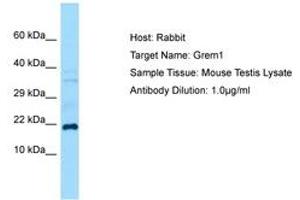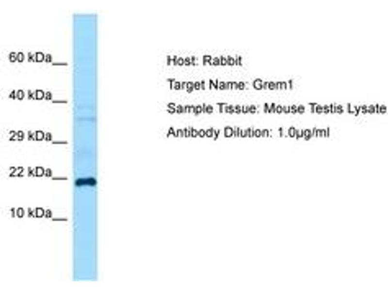 Synthetic peptide from C-Terminus of mouse Grem1 (O70326, NP_035954). Percent identity by BLAST analysis: Human, Chimpanzee, Gorilla, Orangutan, Gibbon, Monkey, Galago, Marmoset, Mouse, Rat, Goat, Elephant, Panda, Dog, Bovine, Bat, Rabbit, Pig, Opossum, Guinea pig (100%), Horse, Xenopus (92%), Zebra finch, Frog, Stickleback, Pufferfish (85%), Drosophila (83%).