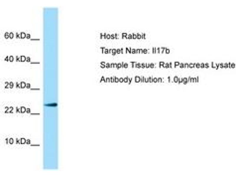 Synthetic peptide from N-Terminus of rat Il17b (G3V8K9, NP_446241). Percent identity by BLAST analysis: Human, Chimpanzee, Gorilla, Orangutan, Gibbon, Monkey, Galago, Marmoset, Mouse, Rat, Ferret, Hamster, Dog, Bat (100%), Bovine, Pig (92%), Guinea pig (91%), Elephant, Panda, Rabbit (84%).