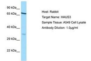 Synthetic peptide located between aa138-187 of human HAUS3 (Q68CZ6, NP_078787). Percent identity by BLAST analysis: Human, Chimpanzee, Orangutan, Gibbon, Bat, Guinea pig (100%), Gorilla, Monkey, Galago, Mouse, Rat, Pig (92%), Elephant, Rabbit (85%), Bovine (84%).