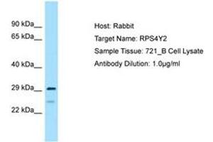 Synthetic peptide from C-Terminus of human RPS4Y2 (Q8TD47, NP_001034656). Percent identity by BLAST analysis: Human, Chimpanzee, Gorilla, Orangutan, Gibbon, Baboon, Monkey, Marmoset, Mouse, Rat, Hamster, Elephant, Panda, Cat, Bovine, Bat, Horse, Pig, Opossum, Guinea pig, Turkey, Chicken, Lizard, Xenopus, Catfish, Zebrafish, Drosophila (100%), Goat, Stickleback, Medaka, Pufferfish (92%), Trout, Salmon, Pike (90%).