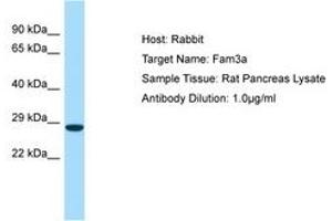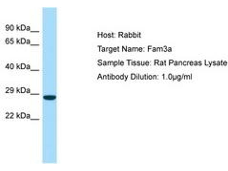 Synthetic peptide located between aa151-200 of rat Fam3a (B5DFJ2, NP_001102794). Percent identity by BLAST analysis: Human, Chimpanzee, Rat, Rabbit, Guinea pig (100%).