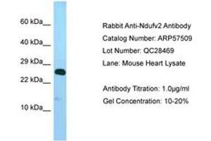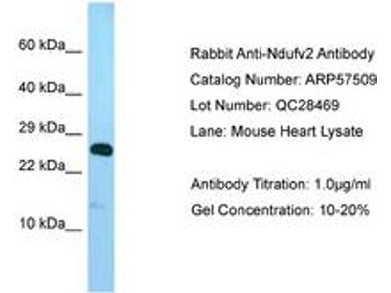 Synthetic peptide located between aa32-81 of mouse Ndufv2 (Q9D6J6, NP_082664). Percent identity by BLAST analysis: Human, Chimpanzee, Gorilla, Orangutan, Gibbon, Baboon, Monkey, Galago, Marmoset, Mouse, Rat, Elephant, Panda, Dog, Bat, Rabbit, Horse, Pig, Opossum, Guinea pig, Platypus (100%), Bovine, Xenopus, Catfish, Medaka, Pike, Zebrafish (92%), Turkey, Zebra finch, Chicken, Lizard, Trout, Salmon, Smelt, Sablefish, Stickleback, Beetle (85%).
