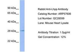 Synthetic peptide from C-Terminus of mouse Lhpp (Q9D7I5, NP_083885). Percent identity by BLAST analysis: Human, Gorilla, Orangutan, Gibbon, Monkey, Marmoset, Mouse, Rat, Elephant, Bovine, Rabbit, Horse, Pig, Guinea pig (100%), Dog, Xenopus (92%), Zebra finch (83%).