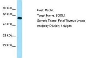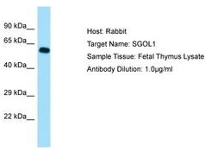 Synthetic peptide located between aa395-444 of human SGOL1 (B5BUA4, NP_001012409). Percent identity by BLAST analysis: Human, Chimpanzee, Gorilla, Orangutan, Gibbon, Monkey (100%), Marmoset (92%).