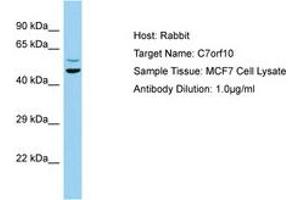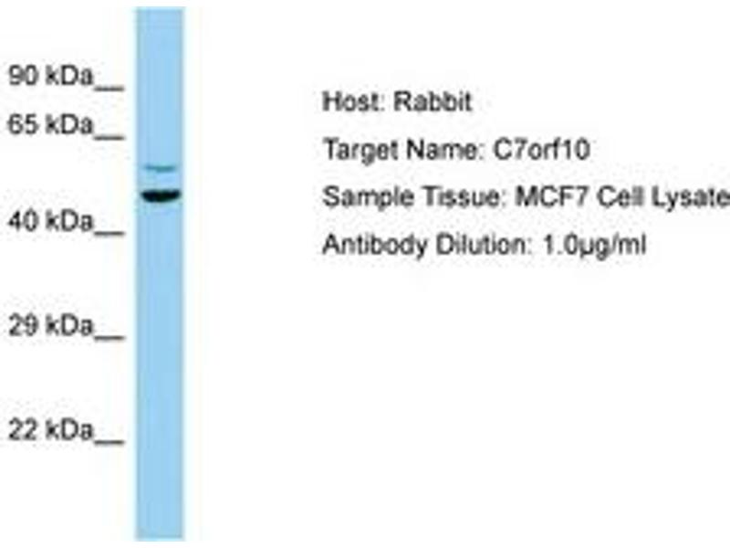 Synthetic peptide located between aa104-153 of human C7orf10 (NP_079004). Percent identity by BLAST analysis: Human, Chimpanzee, Orangutan, Gibbon, Monkey, Marmoset, Mouse, Panda, Bovine, Bat, Rabbit, Horse, Pig, Guinea pig (100%), Opossum, Xenopus (92%), Turkey, Zebra finch, Chicken, Platypus (85%).