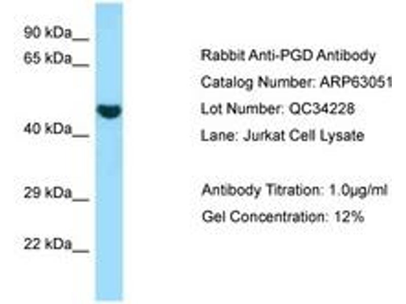 Synthetic peptide located between aa83-132 of human PGD (P52209, NP_002622). Percent identity by BLAST analysis: Human, Chimpanzee, Gorilla, Gibbon, Monkey, Galago, Marmoset, Mouse, Rat, Elephant, Panda, Dog, Bat, Rabbit, Horse, Pig, Opossum, Guinea pig, Turkey, Chicken, Platypus, Salmon, Smelt, Stickleback, Medaka, Pufferfish, Zebrafish (100%), Sheep, Bovine, Lizard, Xenopus, Drosophila (92%).