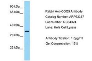 Synthetic peptide located between aa36-85 of human COQ9 (O75208, NP_064708). Percent identity by BLAST analysis: Human, Chimpanzee, Gorilla, Gibbon, Monkey (100%), Orangutan, Marmoset (92%), Galago, Rabbit (85%).