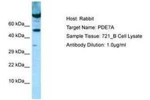 Synthetic peptide located between aa338-387 of human PDE7A (Q13946, NP_001229247). Percent identity by BLAST analysis: Human, Chimpanzee, Gorilla, Orangutan, Gibbon, Monkey, Galago, Marmoset, Mouse, Rat, Elephant, Panda, Dog, Bovine, Bat, Rabbit, Horse, Pig, Opossum, Guinea pig, Turkey, Zebra finch, Chicken, Platypus, Lizard, Xenopus, Seabass, Stickleback, Pufferfish, Zebrafish (100%), Medaka (92%).