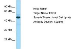 Synthetic peptide located between aa175-224 of human EDC3 (Q96F86, NP_079359). Percent identity by BLAST analysis: Human, Chimpanzee, Gorilla, Orangutan, Gibbon, Monkey, Galago, Marmoset, Mouse, Rat, Elephant, Panda, Dog, Bovine, Bat, Rabbit, Pig, Opossum, Guinea pig (100%), Horse, Turkey, Zebra finch, Chicken, Lizard (92%), Zebrafish (86%), Xenopus, Pufferfish (85%).