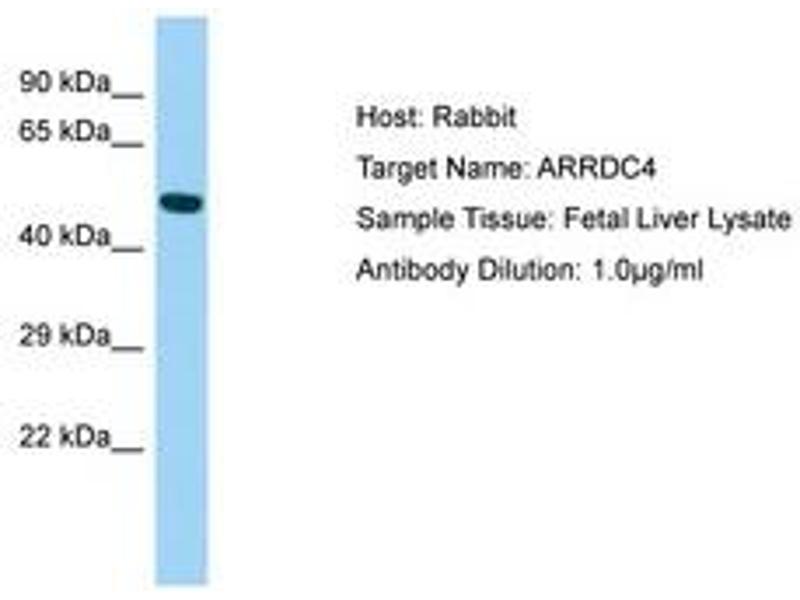 Synthetic peptide from N-Terminus of human ARRDC4 (Q8NCT1, NP_899232). Percent identity by BLAST analysis: Human, Chimpanzee, Orangutan, Gibbon, Monkey, Galago, Panda, Dog, Bovine, Rabbit, Pig, Guinea pig (100%), Marmoset, Mouse, Rat, Elephant (92%).