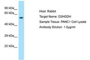 Synthetic peptide located between aa332-381 of human D2HGDH (Q8N465, NP_689996). Percent identity by BLAST analysis: Human, Chimpanzee, Gorilla, Gibbon, Marmoset, Mouse, Rabbit (100%), Orangutan, Monkey, Rat (92%), Horse (85%).