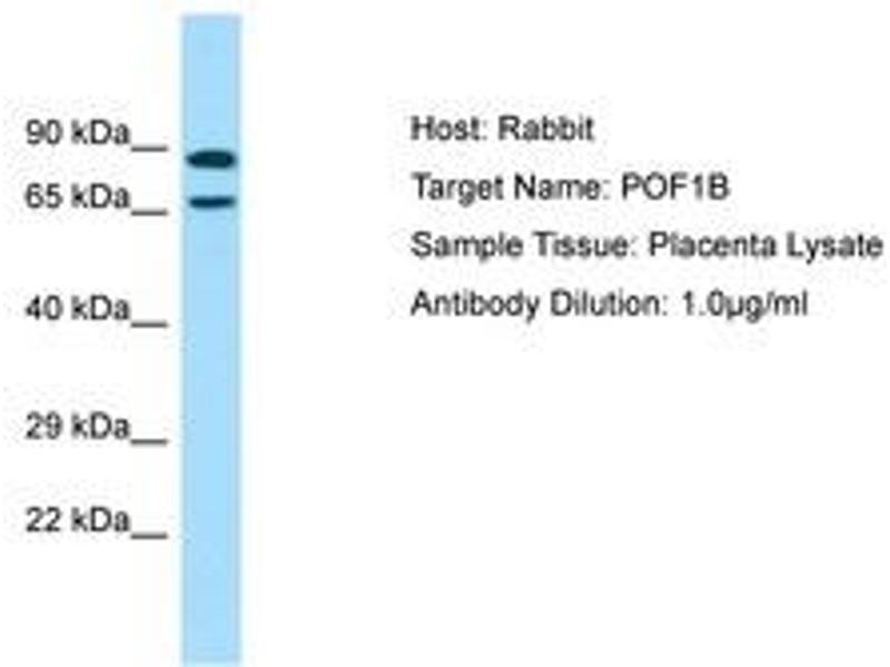Synthetic peptide located between aa469-518 of human POF1B (Q8WVV4, NP_079197). Percent identity by BLAST analysis: Human, Chimpanzee, Gorilla, Orangutan (100%), Gibbon, Monkey, Mouse, Rat (92%), Marmoset, Elephant, Panda, Bat, Rabbit, Pig, Guinea pig (85%).