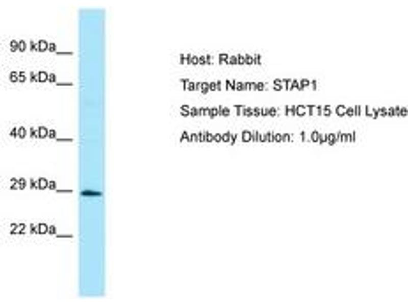 Synthetic peptide located between aa120-169 of human STAP1 (Q9ULZ2, NP_036240). Percent identity by BLAST analysis: Human, Chimpanzee, Gorilla, Gibbon (100%), Orangutan, Marmoset (85%), Galago (84%).
