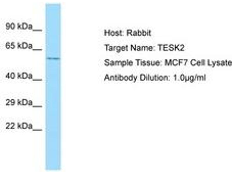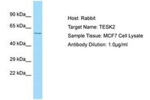 Synthetic peptide from C-Terminus of human TESK2 (Q96S53, NP_009101). Percent identity by BLAST analysis: Human, Chimpanzee, Gorilla, Orangutan, Monkey, Marmoset (100%), Gibbon, Rabbit (92%), Galago, Panda, Bovine, Horse (85%), Rat (78%).