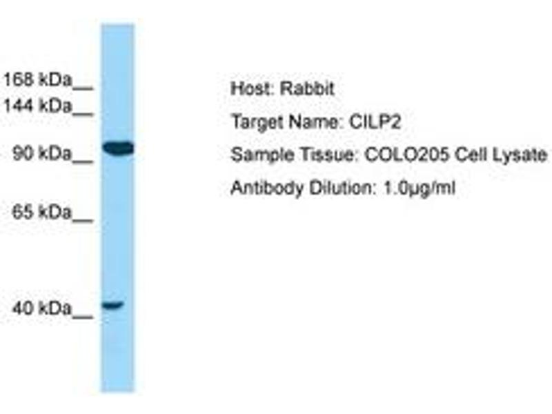 Synthetic peptide located between aa112-161 of human CILP2 (Q8IUL8, NP_694953). Percent identity by BLAST analysis: Human, Chimpanzee, Gorilla, Orangutan, Gibbon, Monkey, Mouse, Rat, Elephant, Dog, Bovine, Bat, Horse, Pig, Guinea pig (100%), Galago (92%), Stickleback (84%).