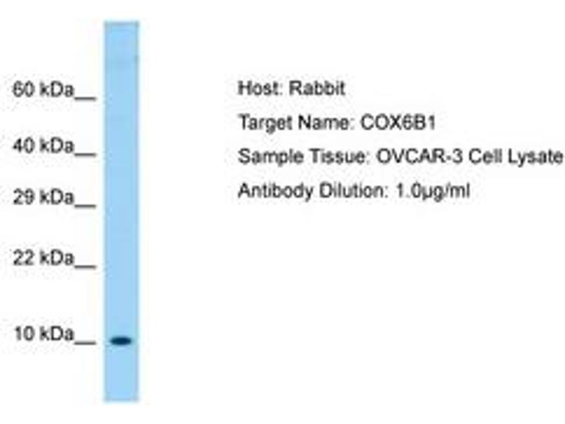 Synthetic peptide located between aa14-63 of human COX6B1 (P14854, NP_001854). Percent identity by BLAST analysis: Human, Chimpanzee, Gorilla, Orangutan, Gibbon, Monkey, Galago, Marmoset, Elephant, Panda, Dog, Bovine, Rabbit, Horse, Pig, Opossum, Guinea pig, Platypus (100%), Mouse, Rat, Seabass, Catfish, Salmon, Sablefish, Pike, Pufferfish, Zebrafish (92%), Lizard, Trout, Smelt (85%).