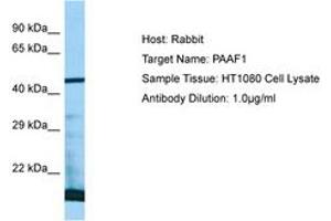 Synthetic peptide located between aa57-106 of human PAAF1 (Q9BRP4, NP_079431). Percent identity by BLAST analysis: Human, Gorilla, Orangutan, Gibbon, Panda, Dog, Bat, Rabbit, Horse, Pig, Guinea pig (100%), Chimpanzee, Monkey, Galago, Elephant, Platypus (92%), Marmoset, Bovine, Opossum (85%).