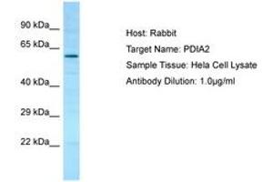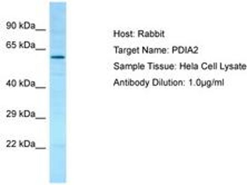 Synthetic peptide located between aa111-160 of human PDIA2 (Q13087, NP_006840). Percent identity by BLAST analysis: Human, Gorilla, Gibbon, Baboon, Monkey, Marmoset, Bovine (100%), Orangutan, Galago, Elephant, Panda, Dog, Bat, Pig (92%), Guinea pig (85%), Mouse, Rat (84%).