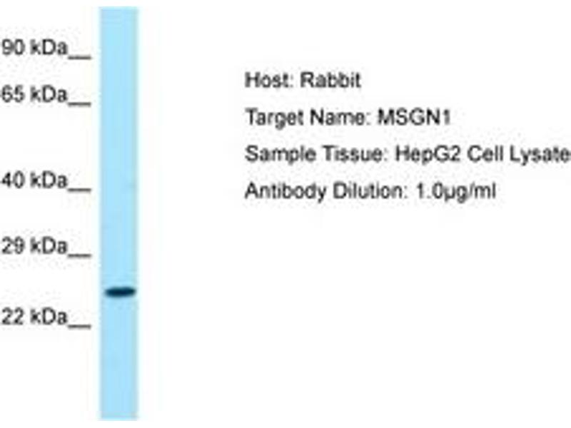Synthetic peptide located between aa104-153 of human MSGN1 (A6NI15, NP_001099039). Percent identity by BLAST analysis: Human, Chimpanzee, Gorilla, Orangutan, Gibbon, Monkey, Galago, Marmoset, Mouse, Rat, Elephant, Panda, Bovine, Bat, Rabbit, Horse, Pig, Lizard, Xenopus (100%), Opossum, Guinea pig, Turkey, Zebra finch, Chicken, Platypus (92%).