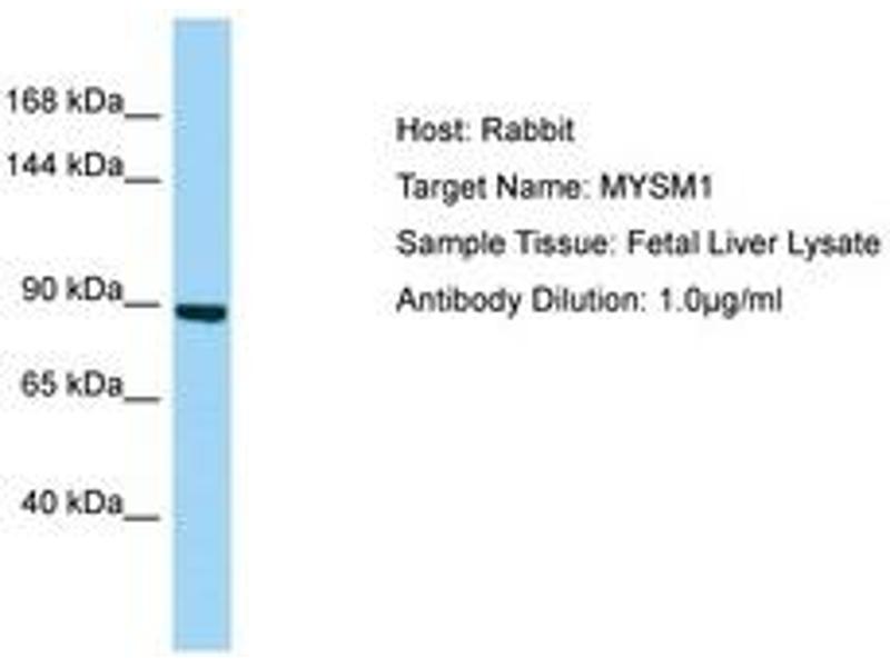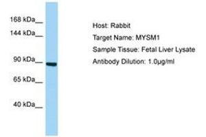Synthetic peptide from C-Terminus of human MYSM1 (Q5VVJ2, NP_001078956). Percent identity by BLAST analysis: Human, Chimpanzee, Gorilla, Orangutan, Gibbon, Monkey (100%), Marmoset (92%), Panda, Dog (85%).