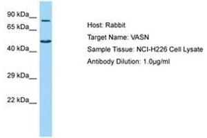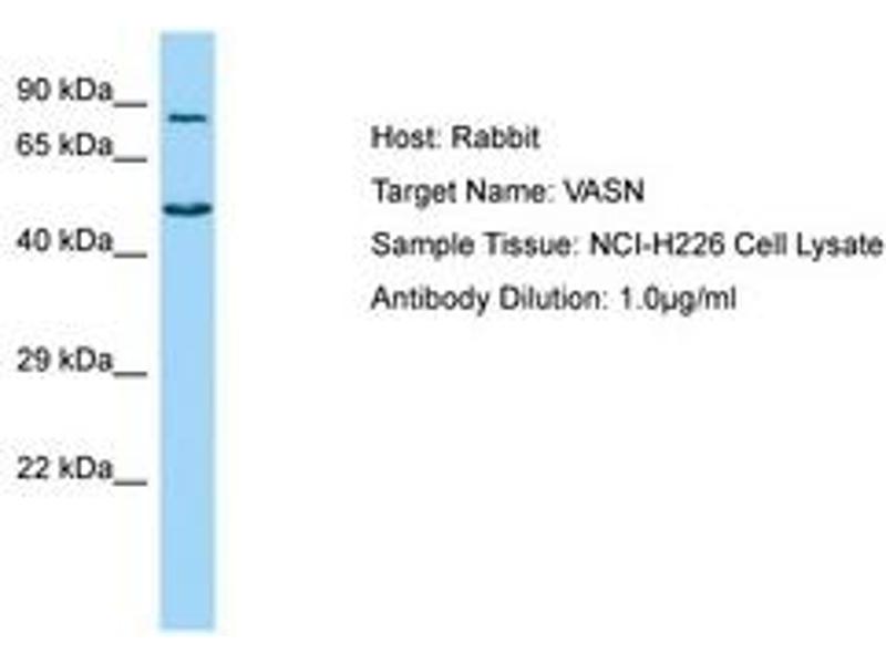 Synthetic peptide located between aa521-570 of human VASN (Q6EMK4, NP_612449). Percent identity by BLAST analysis: Human, Chimpanzee (100%).